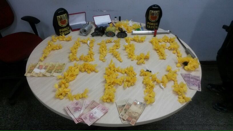 Os policiais foram averiguar denúncia de que havia tráfico de droga na rua Pérola, naquele residencial e, apoiados pela viatura 1897, abordaram os suspeitos. Com ele foi encontradas porções mais de meio quilo de drogas, além de pedras de oxo, cocaína em pó, pasta-base, arma caseira calibre 12, balança e mais R$ 310.