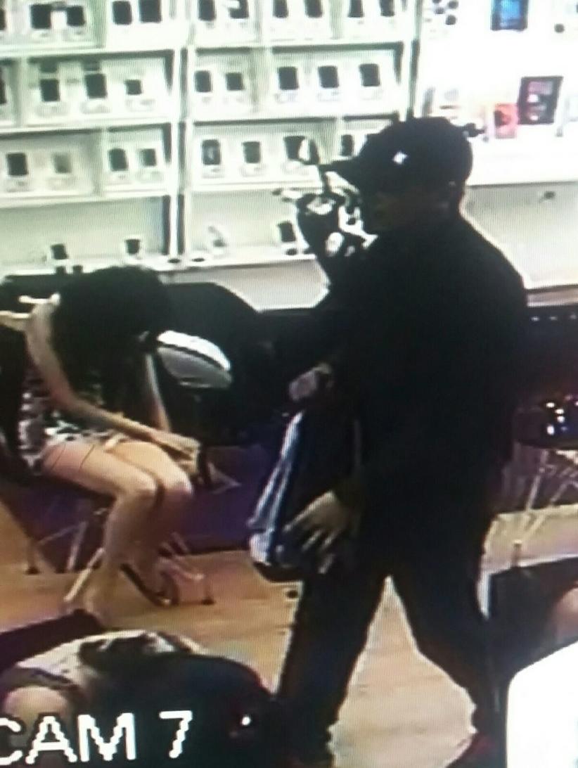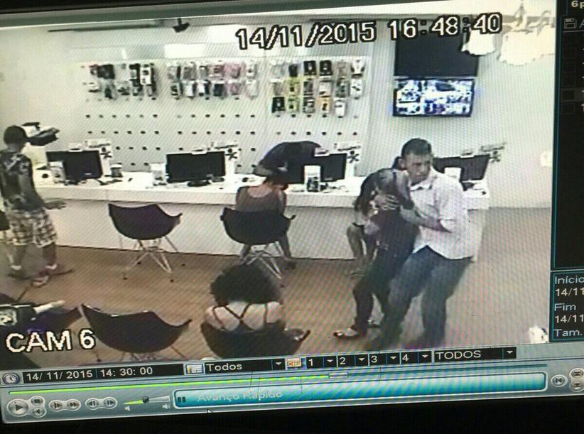 Dois homens armados invadiram a loja e renderam funcionários e clientes. Eles levaram cerca de 30 aparelhos celulares do estabelecimento. Durante a ação, um dos assaltantes chega a apontar a arma para a cabeça de uma funcionária, que chora desesperada.