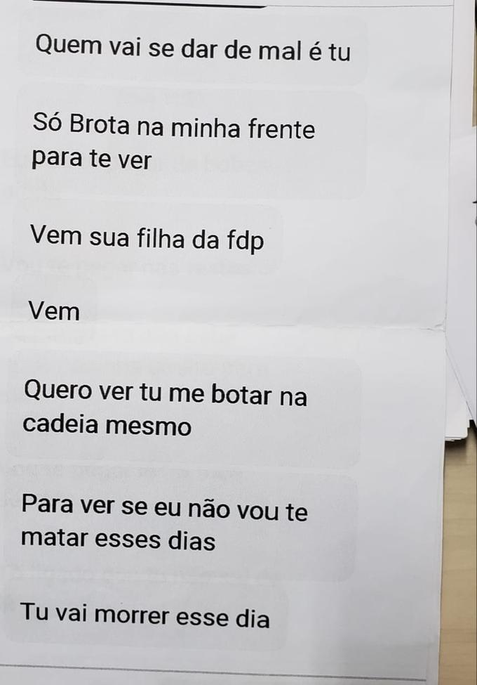 "Quem vai se dar mal é tu. Só brota na minha frente pra te (sic) ver. Vem sua filha da fdp (sic). Quero ver tu me botar na cadeia mesmo, para ver se eu não vou te matar esses dias. Tu vai morrer esse dia", diz as mensagens.