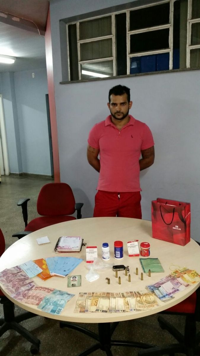 O traficante Ocinei de Araújo Cruz, de 28 anos, foi preso no bairro Novo Reino, zona Leste, com 80 gramas de cocaína, três pacotes de bicarbonato de sódio (usado para aumentar a quantidade da droga), munições calibre 38, munição deflagrada de calibre 40 e um veículo Golf, preto, JWR 2165, com chassi adulterado.