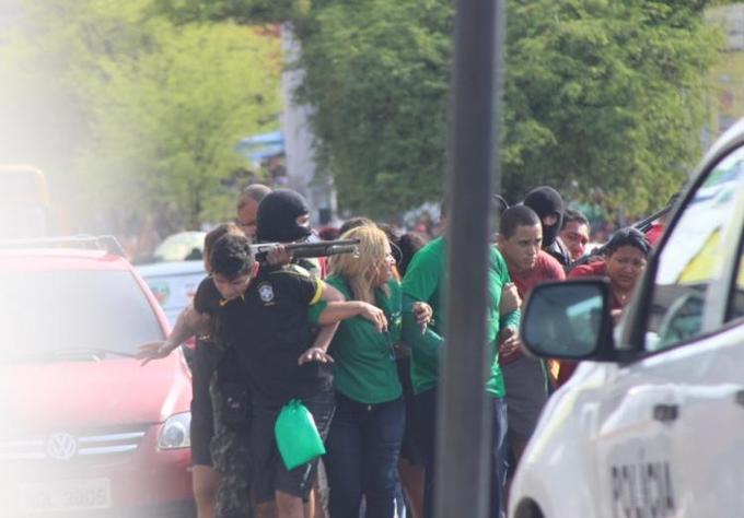 Mais de 10 reféns foram usados como escudo humano pelos criminosos e levados para uma área de invasão. A polícia conseguiu dar fim ao sequestro e os suspeitos foram baleados.