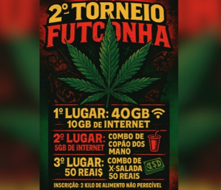 Manaus/AM - Um campeonato de futsal com uma proposta inusitada foi interrompido pela Polícia Militar na noite de quarta-feira (14), na Zona Sul de Manaus. Intitulado '2º Torneio Futconha', o evento, que ocorria em uma quadra do Prosamim, no bairro Praça 14 de Janeiro, supostamente ofereceria porções de maconha como prêmio aos times vencedores.