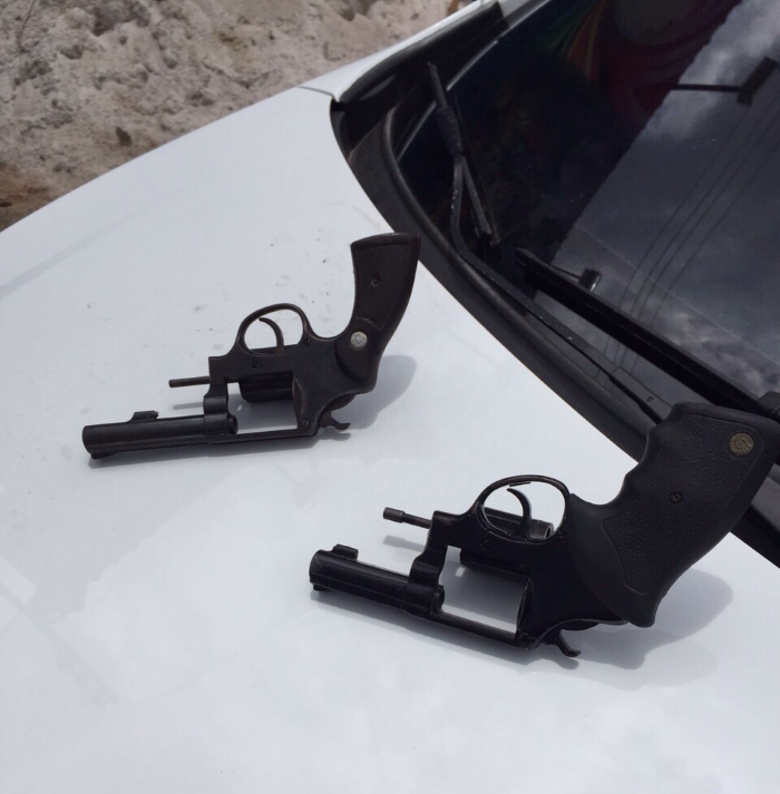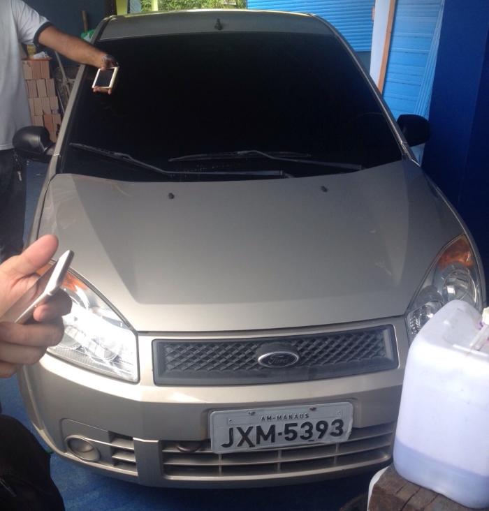 Com a dupla a polícia encontrou um Fiesta, cor dourada, e um Ônix de cor branca. Além disso, eles estavam com dois revólveres calibre 38 e seis munições. Jhonata tem um mandado de prisão em aberto e expedido há dois anos, também por roubo de veículo.