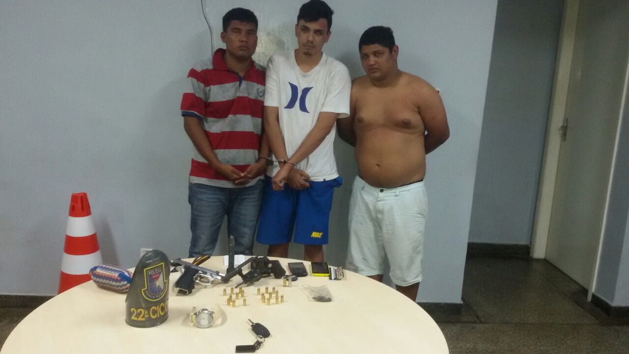 Aboradados pelo sargento Moura, com o trio foram encontradas duas armas e alguns celulares.
