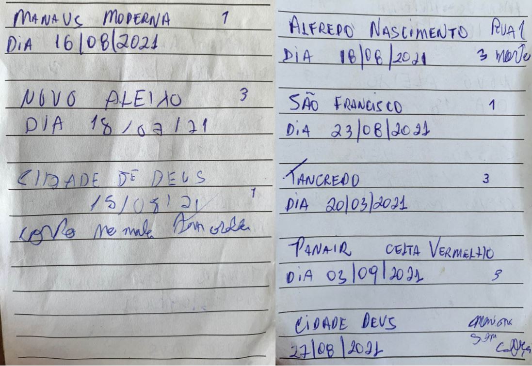 O registro foi encontrado na casa em que Lucas morava, no bairro Novo, na rua P32, na Zona Leste. Os ataques aconteciam em todas as zonas de Manaus, em bairros como Compensa, Alfredo Nascimento, Educandos, Novo Aleixo, Tancredo Neves, São Francisco e outros.