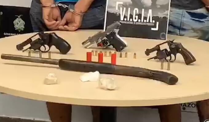Com eles foram apreendidas dois revólveres calibre 38, uma escopeta, uma pistola calibre 380 e drogas.