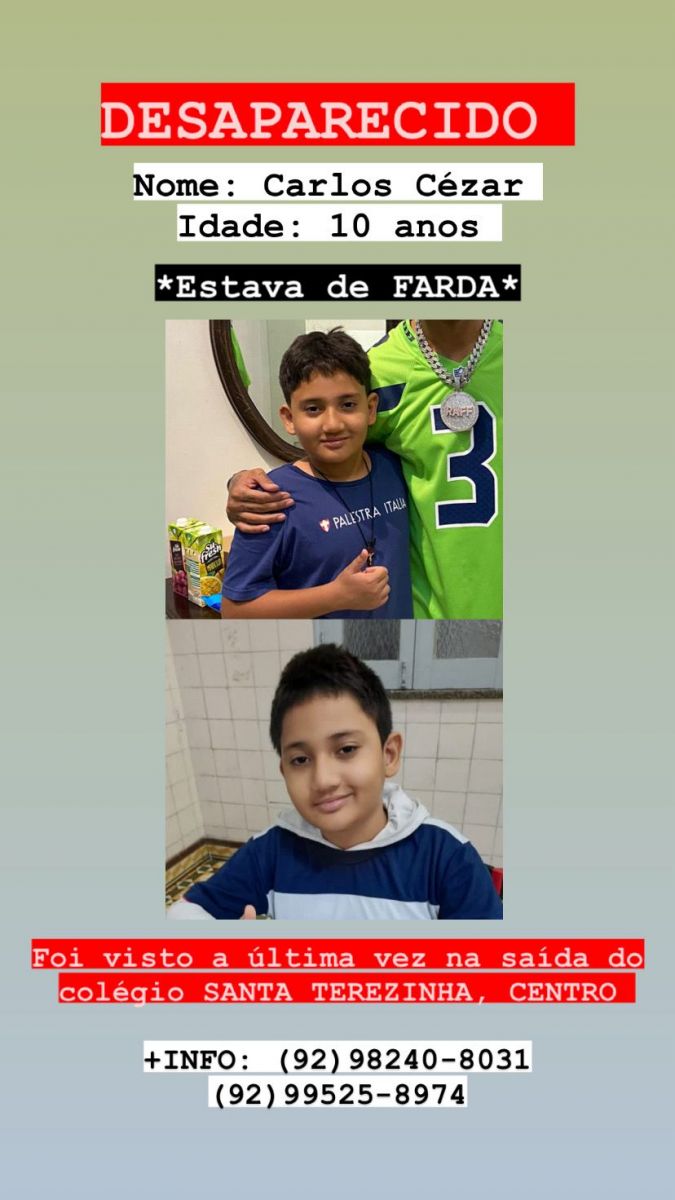Manaus/AM - Carlos Cézar, de 10 anos, está desaparecido desde a manhã desta quarta-feira (6), quando saiu do Colégio Santa Terezinha, localizado no Centro de Manaus, onde ele estuda.