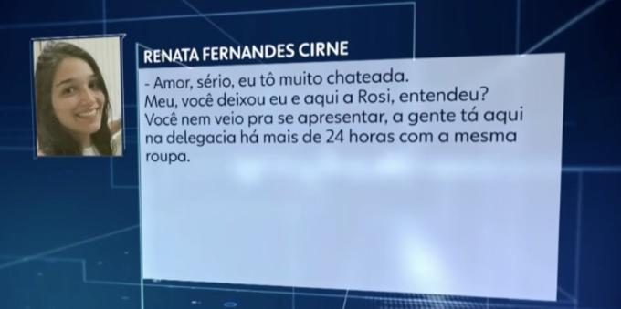 Em um áudio divulgado pelo Jornal Nacional nessa segunda-feira (23), Renata diz ao médico que está detida juntamente com a técnica de enfermagem Rosilene Pereira da Silva e reclama da falta de apoio dele:
