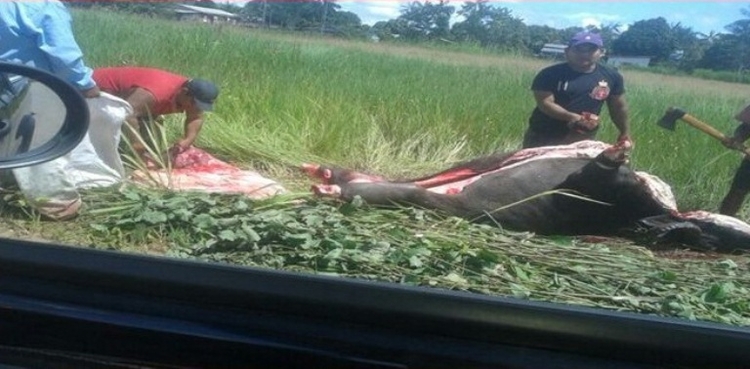 Após uma denúncia, a viatura da polícia militar verificou a ocorrência e se deparou com o grupo esquartejando o animal, além de crianças observando e a presença de urubus voando baixo, podendo causar acidentes de veículos que passavam no local.