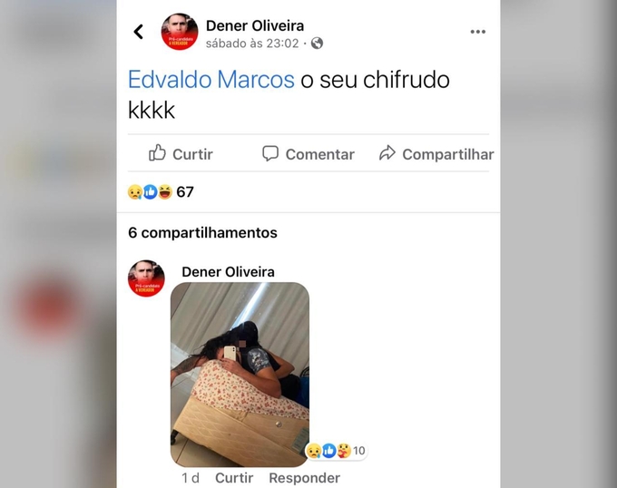 Dener Silva de Oliveira, de 24 anos, foi morto com uma facada no peito no último sábado (19/09) em Perolândia/Go. O crime ocorreu após o jovem postar no Facebook que o tio Edvaldo Marcos de Paula, de 47 anos, era “chifrudo”. Estas informações são do G1 GO.