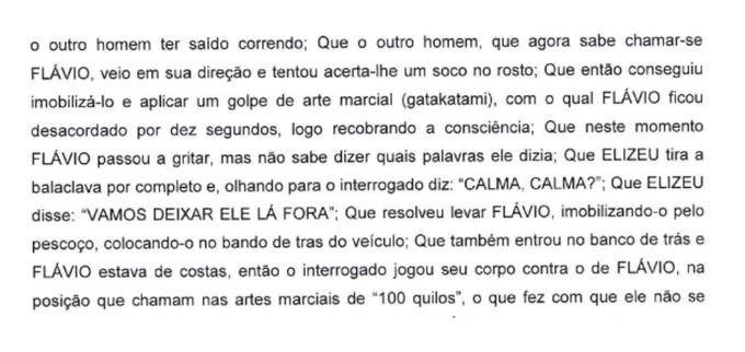 - PM Elizeu passa rápido pela portaria falando “abre, abre” para o porteiro. Ele não queria ser identificado por Magno, que estava recebendo atendimento na portaria. Flávio está imobilizado no banco de trás com a cabeça para baixo, pressionada pelo peito de Mayc. A ideia, segundo Mayc, era deixá-lo fora do condomínio com vida.