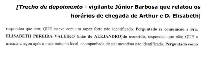 - Elizabeth Valeiko chega no condomínio e encontra Alejandro com sangramentos na região do rosto e camisa, notou que ele estava sob efeito de álcool ou entorpecente. Questionou ao filho o que estava acontecendo, ele não soube explicar, pelo contrário, falou “mãe, tá tudo bem!”.