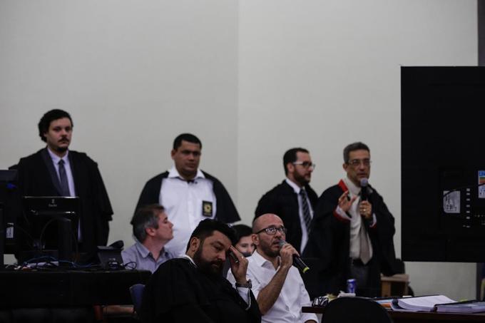 O julgamento já foi retomado e Gustavo responde agora as perguntas do advogado de defesa, Claúdio Dalledone.