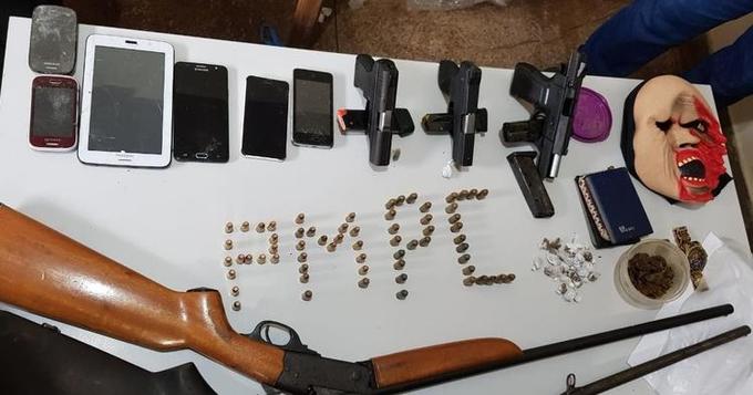 O delegado titular da 37ª DIP informou que, ao longo dos trabalhos, foram encontradas no lugar duas espingardas calibre 16, duas pistolas, sendo uma de calibre 380 e outra de calibre PT40, 31 munições de calibre 9 milímetros, 21 trouxinhas de maconha do tipo skunk, uma porção pequena de oxi, cinco aparelhos celulares, um tablet, dois relógios.