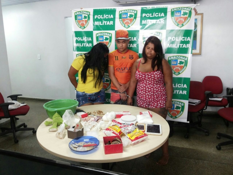 Manaus/AM - O trio Caroline Moriz da silva, 18, Fabiano Monteiro de Melo, 23 e Kelly da Costa Pimentel, 27, foram detidos na tarde desta sexta-feria (17) suspeitos de tráfico de drogas. A prisão aconteceu na rua B, loteamento Bairro Novo, bairro Jorge Teixeira, zona Leste de Manaus. Policiais militares da 30ª Companhia Interativa Comunitária (Cicom) chegaram até os três após uma denúncia anônima. Com o trio foram apreendidos 50 porções de oxi, 680g de pasta base cocaína, aparelhos eletrônicos comprados a partir do tráfico e a quantia de R$ 45,00, o que provalevemente deve ser o troco de todo o gasto.