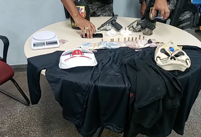 Ainda de acordo com a polícia, ao chegar ao local, foram encontradas drogas, duas armas de fogo, máscaras de palhaço, e blusas do mesmo modelo usadas por integrantes da Facção Família do Norte (FDN) na noite de terça-feira (29).