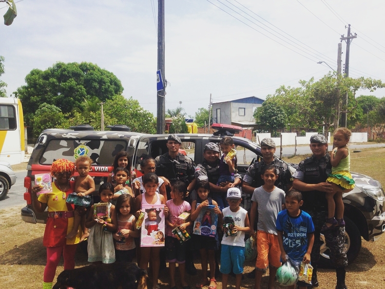 Manaus/AM - Policiais militares da Ronda Ostensiva Cândido Mariano (Rocam) os conhecidos "Ursinhos Carinhosos", Comando de Operações Especiais (COE) e Batalhão de Policiamento Ambiental (BPAmb), efetuaram na manhã desta segunda-feira (12) a entrega de vários brinquedos para crianças carentes do ramal do Brasileirinho, bairro Jorge Teixeira, zona Leste de Manaus. A ação foi uma decisão dos próprios PMs, que reuniram no último mês uma quantia em dinheiro para que pudessem comprar os brinquedos.