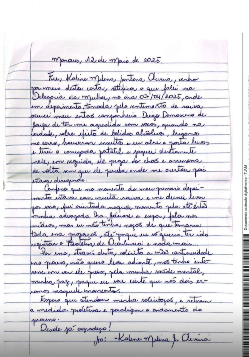 Manaus/AM - Uma carta escrita por Kaline Milena , anexada ao processo em que ela pede a absolvição e a retirada das medidas protetivas contra o namorado, o cantor de forró Diego Damasceno, suspeito de tê-la agredido, no bairro do Parque Dez, em Manaus, foi amplamente divulgada nas redes sociais. O documento, datado de 12 de maio de 2025, traz à tona um novo depoimento da mulher, contradizendo o que ela havia declarado após o crime.