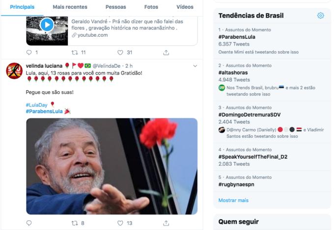 As felicitações para o ex-presidente, preso desde 2018, movimentaram o twitter e lhe rendeu o primeiro lugar no ranking sobre os assunto mais comentado nas primeiras horas da manhã deste domingo, na rede social.