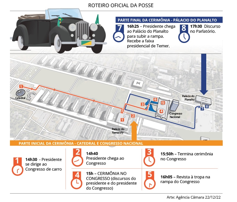 O roteiro da posse prevê a chegada dos convidados (entre eles os chefes de Estado e de governo) ao Congresso Nacional a partir das 13h45. Lula e o vice-presidente Geraldo Alckmin deverão chegar à Catedral de Brasília por volta das 14h20. Às 14h30, Lula sairá em carro aberto em direção ao Congresso – percurso que deve durar dez minutos, apesar da proximidade.