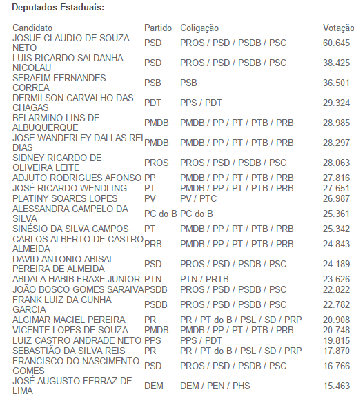 Governador: JOSÉ MELO DE OLIVEIRA, do PROS, e Vice-Governador: JOSÉ HENRIQUE OLIVEIRA, candidatos pela coligação PROS / DEM / PSL / PTN / PSC / PR / PRTB / PHS / PTC / PV / PRP / PSDB / PEN / PSD / SD / PT do B, eleitos com 869.992 votos.