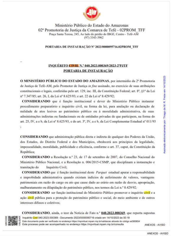 De acordo com o Inquérito Civil n° 040.2023.000369/2023-2°PJTF, o promotor determinou que "reiterem-se os ofícios dirigidos aos investigados, a fim de que responda o expediente retro, haja vista inércia anterior. Fixo como prazo de resposta dez dias corridos", afirma trecho da matéria.