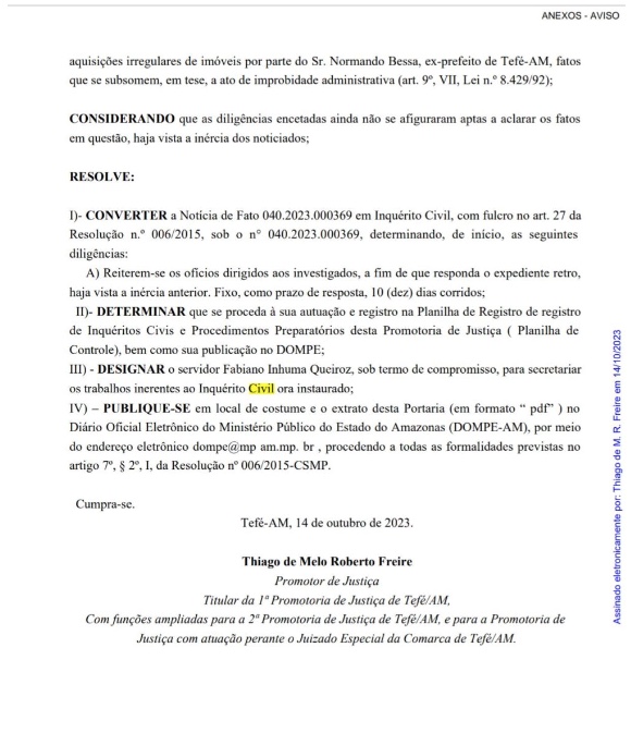Manaus/AM - O promotor de Justiça Thiago de Melo Roberto Freire determinou abertura de um inquérito civil para investigar o ex-prefeito de Tefé (a 521 quilômetros de Manaus), Normando Bessa (Progressista), por suposta aquisição irregular de imóveis, o que é considerado ato de improbidade administrativa.