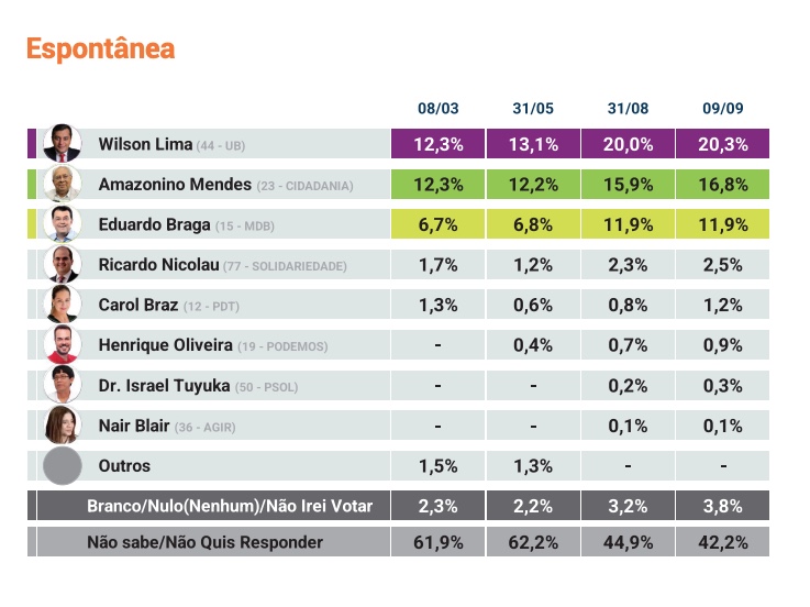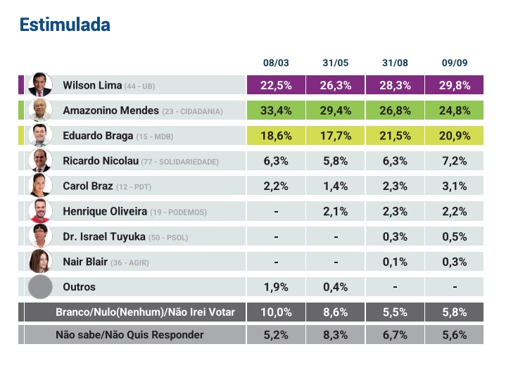 De acordo com a pesquisa, registrada no Tribunal Superior Eleitoral (TSE) sob número AM-02687/2022, no cenário espontâneo, Wilson Lima está com 20,3% e Amazonino Mendes (Cidadania) com 16,8%, seguido de Eduardo Braga (MDB), que aparece no terceiro lugar com 11,9%.