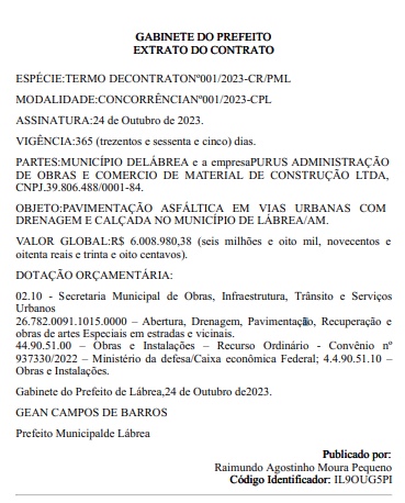 De acordo com publicação desta quarta-feira (25) do Diário Oficial dos Municípios, da Associação Amazonense dos Municípios (AAM), a empresa escolhida para a realização das obras é a Purus Administração de Obras e Comércio de Material de Construção LTDA, localizada em Manaus.