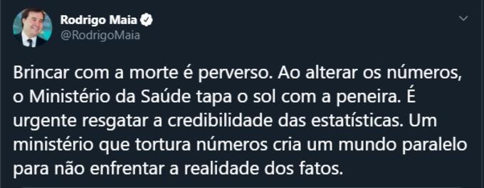 Ao comentar sobre uma matéria do Sistema Globo sobre a divulgação de números divergentes de casos e mortes por coronavírus no Brasil, Maia chamou de "perverso" a atitude da pasta e considerou "ruim" ter que pedir pela atualização dos dados.