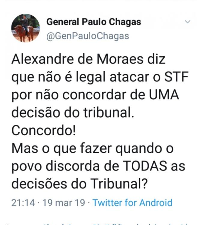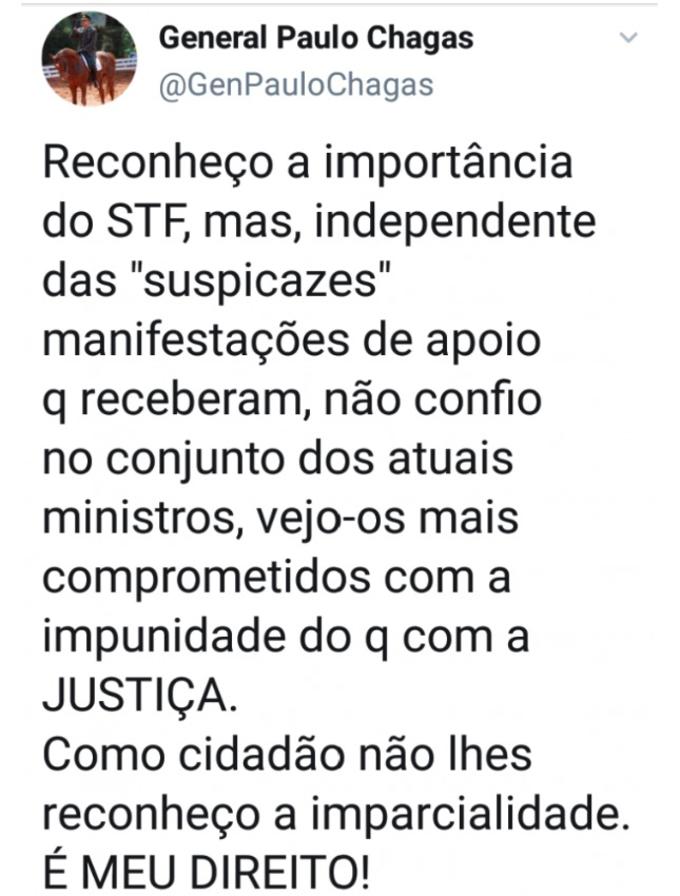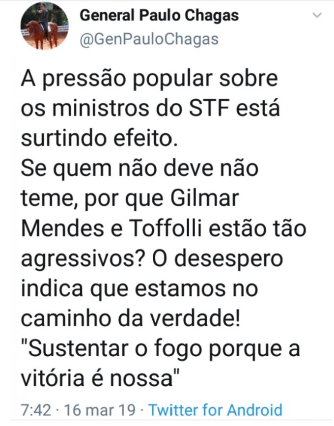 Em seu Twitter, Paulo Chagas costuma fazer críticas ao Supremo. No dia 16 de março, o general escreveu. “A pressão popular sobre os ministros do STF está surtindo efeito. Se quem não deve não teme, por que Gilmar Mendes e Toffolli estão tão agressivos? O desespero indica que estamos no caminho da verdade! “Sustentar o fogo porque a vitória é nossa”.”