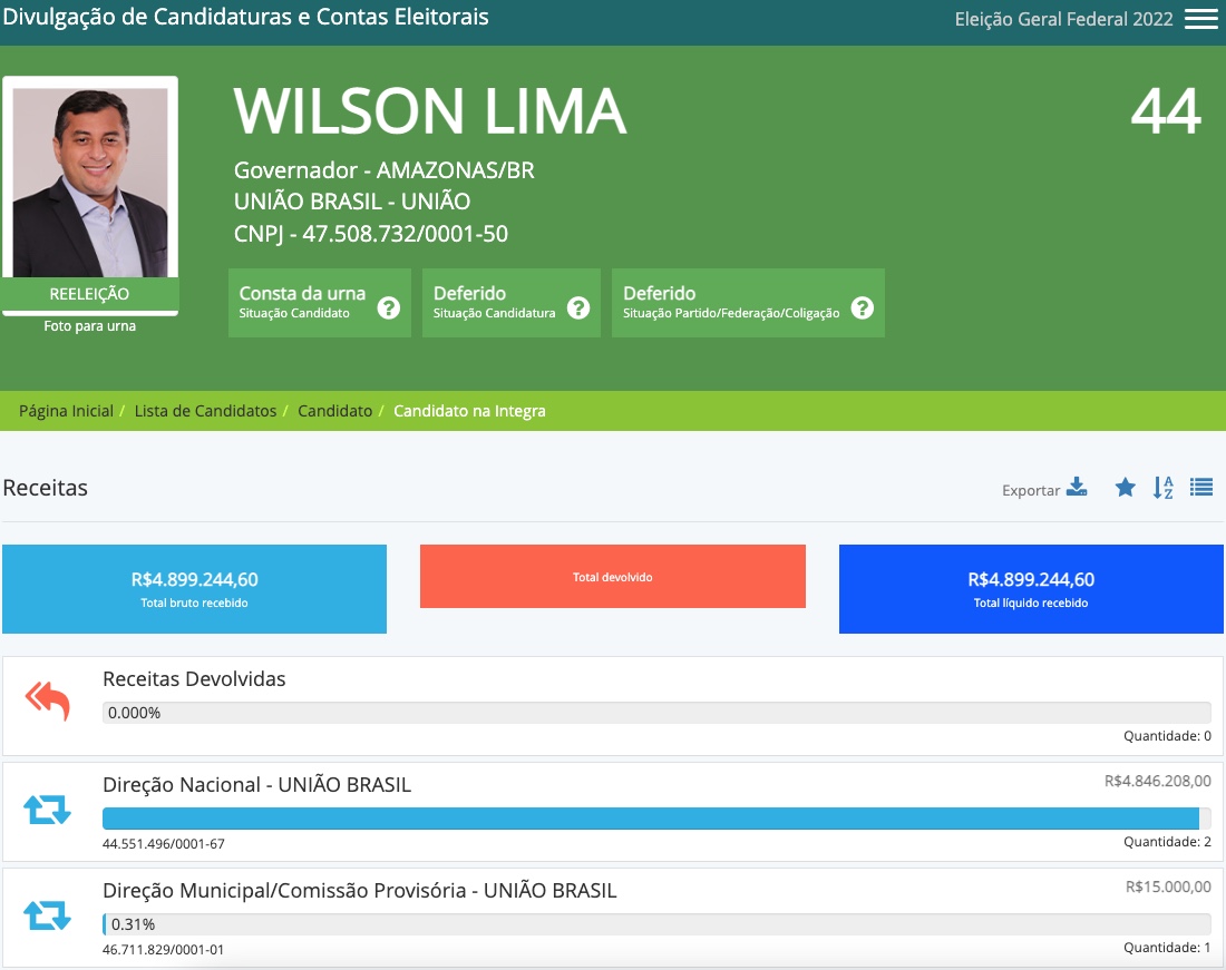 Manaus/AM - O partido União Brasil, pelo qual o candidato Wilson Lima tenta se reeleger como candidato ao Governo do Amazonas, doou no início deste mês mais R$ 2 milhões para o postulante gastar em sua campanha. Somando-se aos mais de R$ 2,8 milhões doados no fim de agosto, o candidato dispõe de R$ 4,8 milhões de reais.