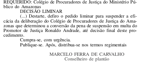 O Conselho Nacional do Ministério Público revogou decisão do Colégio de Procuradores do Amazonas que transformava a pena de suspensão do promotor de justiça Ronaldo Andrade em multa. Na medida inicial o MP do Amazonas havia estabelecido que o promotor, acusado de não impedir o uso abusivo de força em ação policial durante uma operação em Presidente Figueiredo, ficaria sem atividade e salário durante 90 dias, mas a decisão não foi aplicada porque Andrade ingressou com vários recursos.O próprio CNMP decidiu que a penalidade deveria ser aplicada imediatamente.