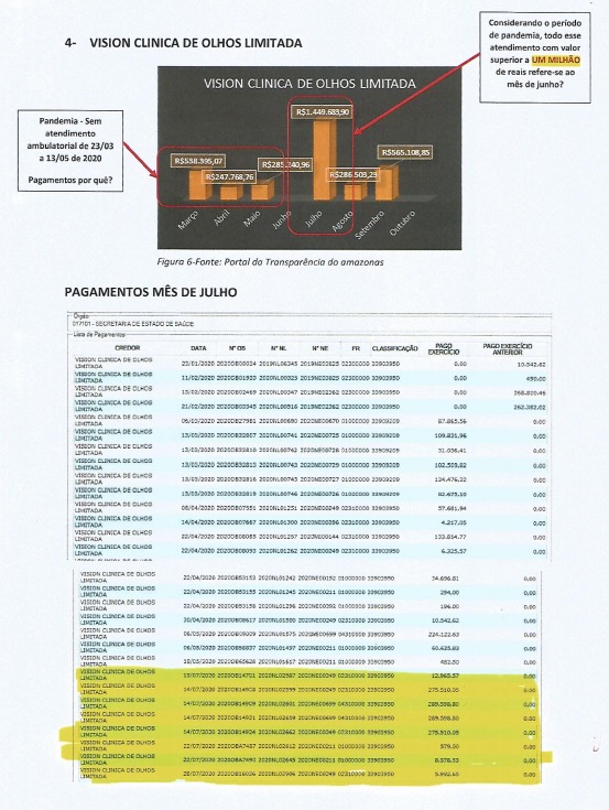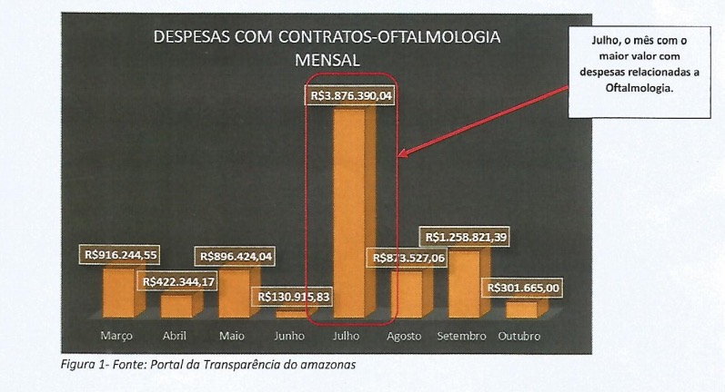 Na comparação entre as três empresas que mais acumularam valores, o mês de julho registrou maior número despesas com serviços oftalmológicos. Neste período, a Vision Clínica de Olhos LTDA teve mais de R$ 1 milhão em despesas, seguida pelo Centro de Diagnóstico Oftalmológico da Amazônia (R$ 880 mil) e pelo Centro Oftalmológico São Domingos (R$ 556 mil).