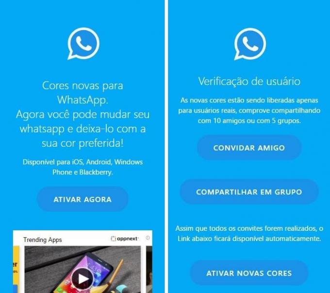 Segundo a PSafe, o mais novo deles já fez mais de 1 milhão de vítimas e é disseminado por hackers via WhatsApp. O usuário recebe uma mensagem com a possibilidade de ativar uma nova função que permite personalizar o aplicativo com a sua cor preferida.