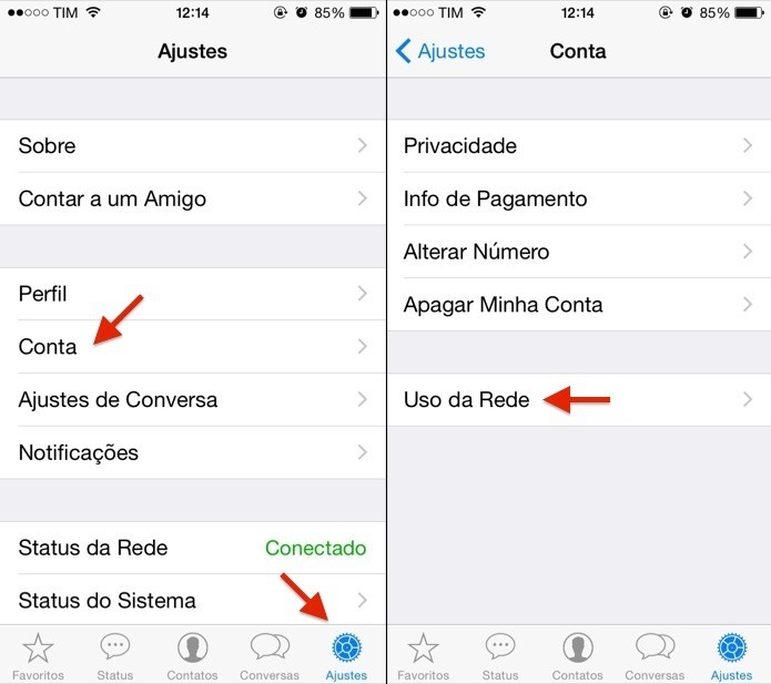 Passo 1. No aplicativo do WhastApp toque sobre “Ajustes”, no canto inferior direito da tela. Nas configurações do aplicativo, toque em “Conta” e, em seguida, em “Uso da Rede”;
