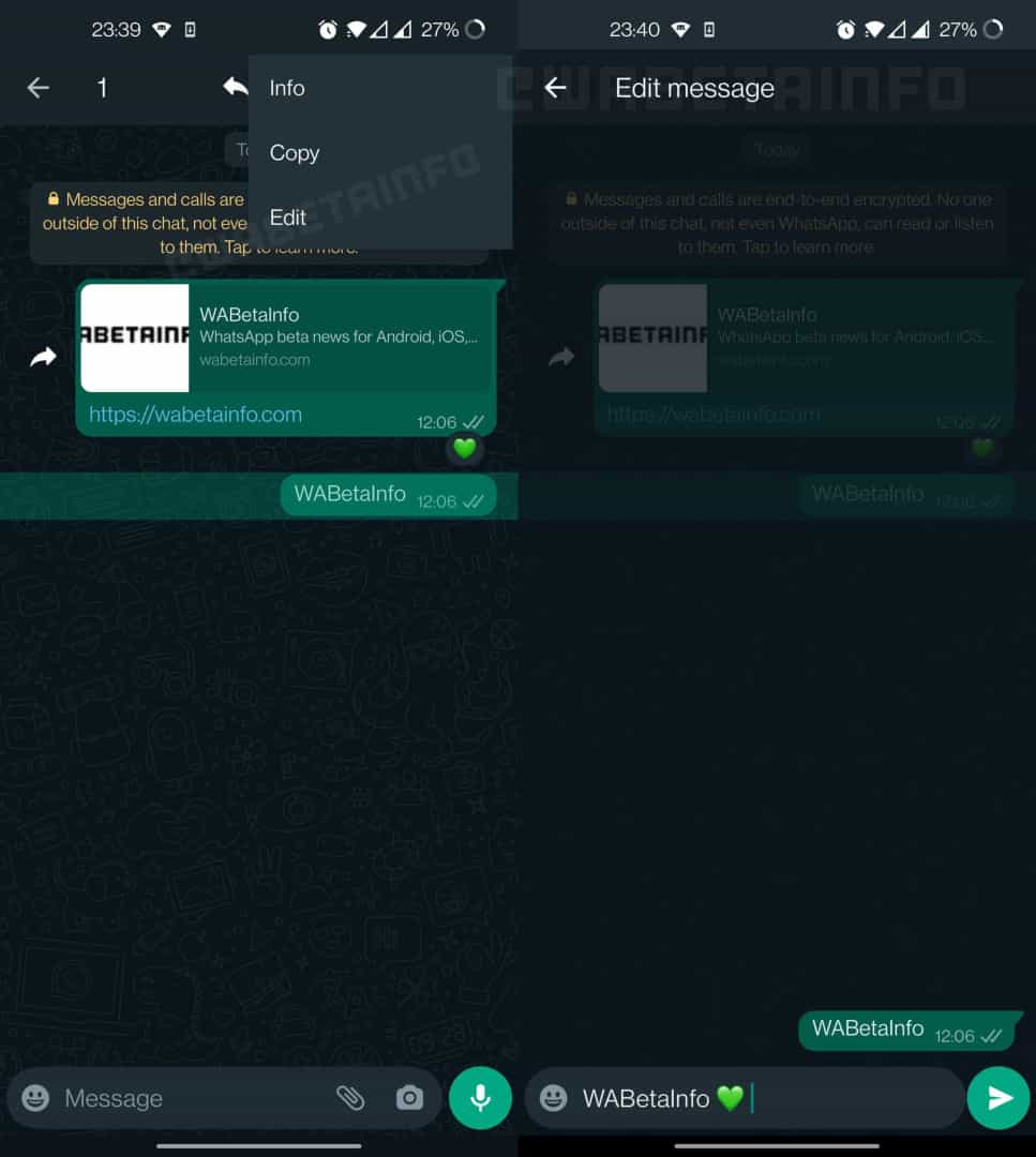Entende-se que essa implementação e testes estão em andamento na versão beta do WhatsApp para Android, e a versão iOS também a receberá. No entanto, não está claro se os usuários serão notificados de que a mensagem foi editada.