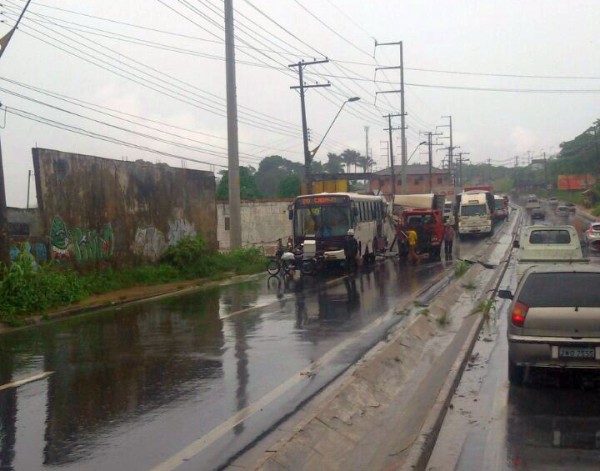 Manaus/AM – Acidente envolve caminhão, placas JXB-7240, que abalroou ônibus da linha 310, nº de ordem 0211043, da empresa Açaí, na rodovia Vital de Mendonça, no Tarumã, zona Oeste, na tarde desta terça-feira, 6.