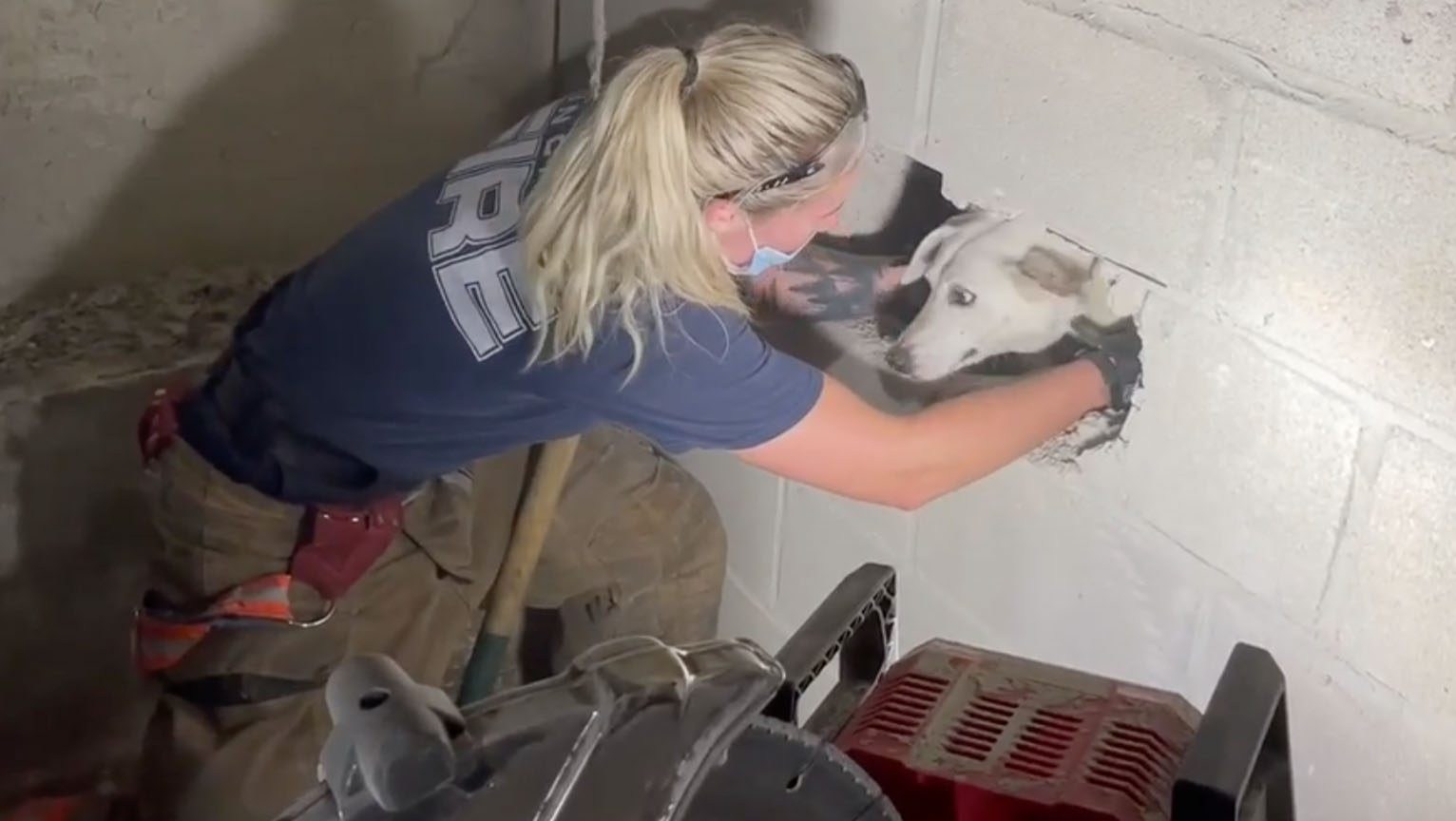 Os bombeiros correram para o local e tiveram que destruir a parede com uma marreta na tentativa de resgatar o cachorro. Getty está desaparecido há cinco dias. O bastão cairá da fenda e ficará preso atrás da parede. O animal foi resgatado com sucesso sem ferimentos. Confira a foto do momento que encontraram a cadelinha: