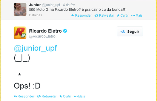 Ao responder a uma insinuação de um dos seguidores no Twitter, a loja de eletrodomésticos Ricardo Eletro postou um sinal que simboliza o famoso "tomar no c*".