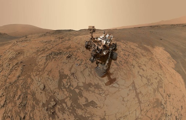 A sonda Curiosity tira uma selfie enquanto trabalha no monte Sharp, em Marte. Ela encontrou evidências de água líquida no planeta, na cratera Gale (Foto: NASA)